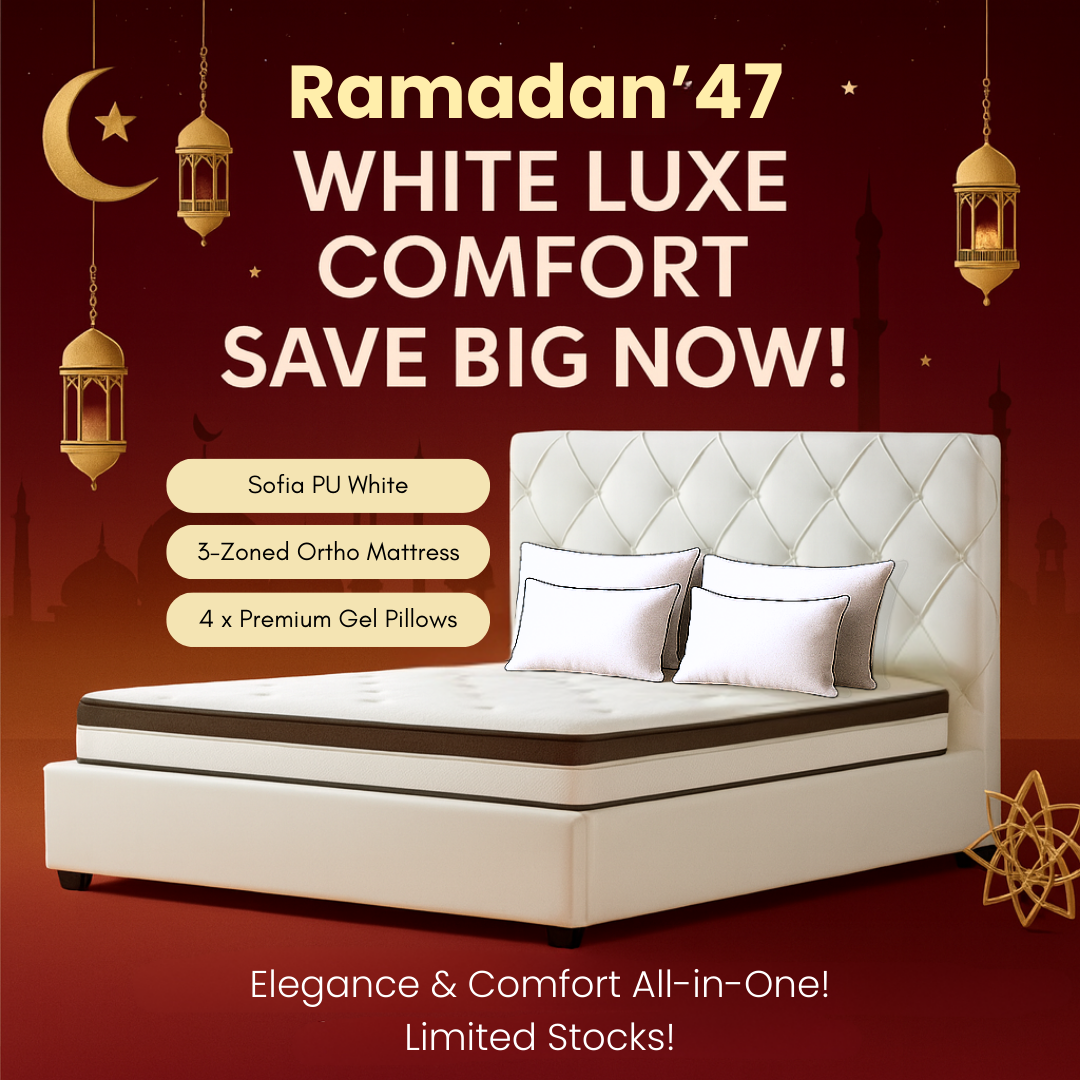 Create a refined Ramadan sanctuary with the White Luxe Comfort Package – a complete bedroom bundle that brings together elegant design and supportive, restorative sleep. This coordinated set features the Sofia PU White bed frame, a 3-Zoned Ortho Mattress and four Premium Gel Pillows, curated for a serene, hotel-inspired sleep experience at home.